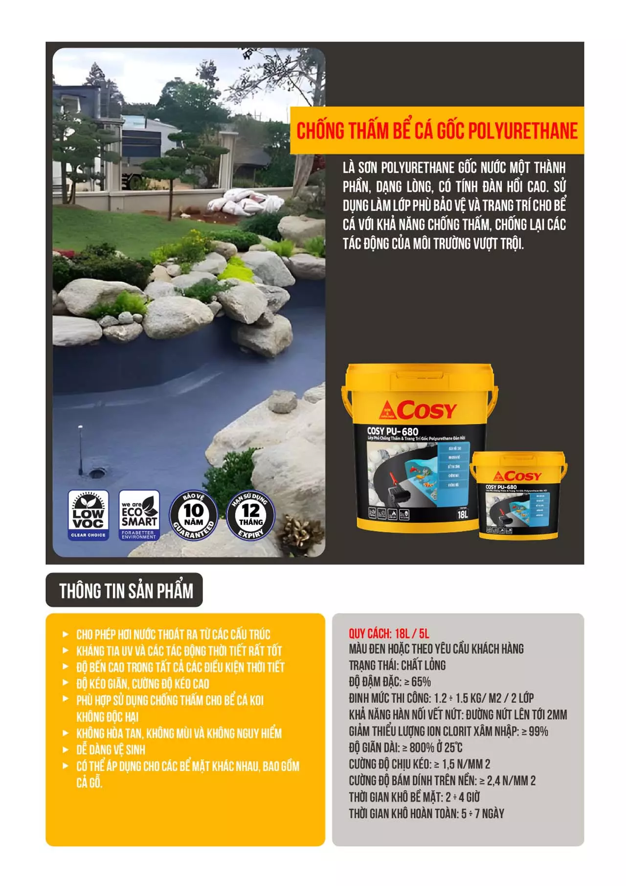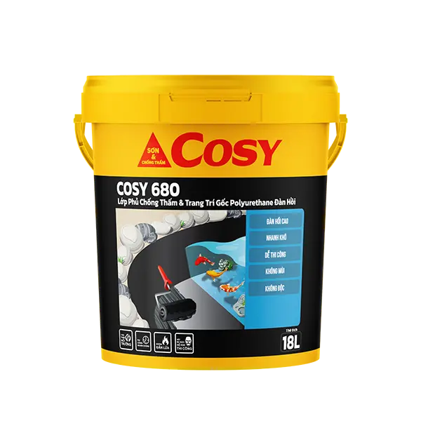 Cosy Pu-680 là hợp chất chống thấm polyurethane dạng lỏng, gốc nước, một thành phần. Lớp phủ sau khi hình thành có màu đen bóng, bền thời tiết, kháng tia UV, có khả năng kháng mài mòn, không bị thủy phân, không độc hại và thân thiện với môi trường, nguồn nước.