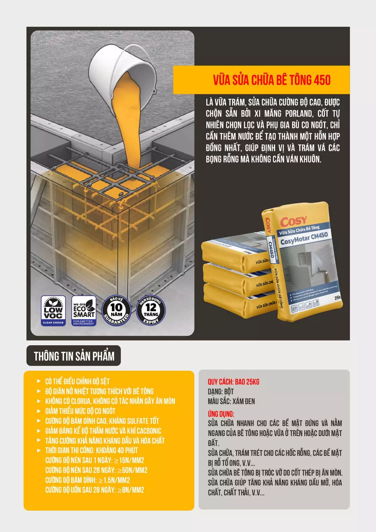Vữa sửa chữa Bê Tông Cosy CM 450 là vữa trám vá, sửa chữa polyme, không co ngót cường độ cao một thành phần, được trộn sẵn bởi xi măng Porland, cốt liệu tự nhiên chọn lọc và phụ gia bù co ngót. Chỉ cần thêm nước để tạo thành hỗn hợp vữa đồng nhất kết dính cao giúp định hình và trám vá các bọng rỗng mà không cần ván khuôn.